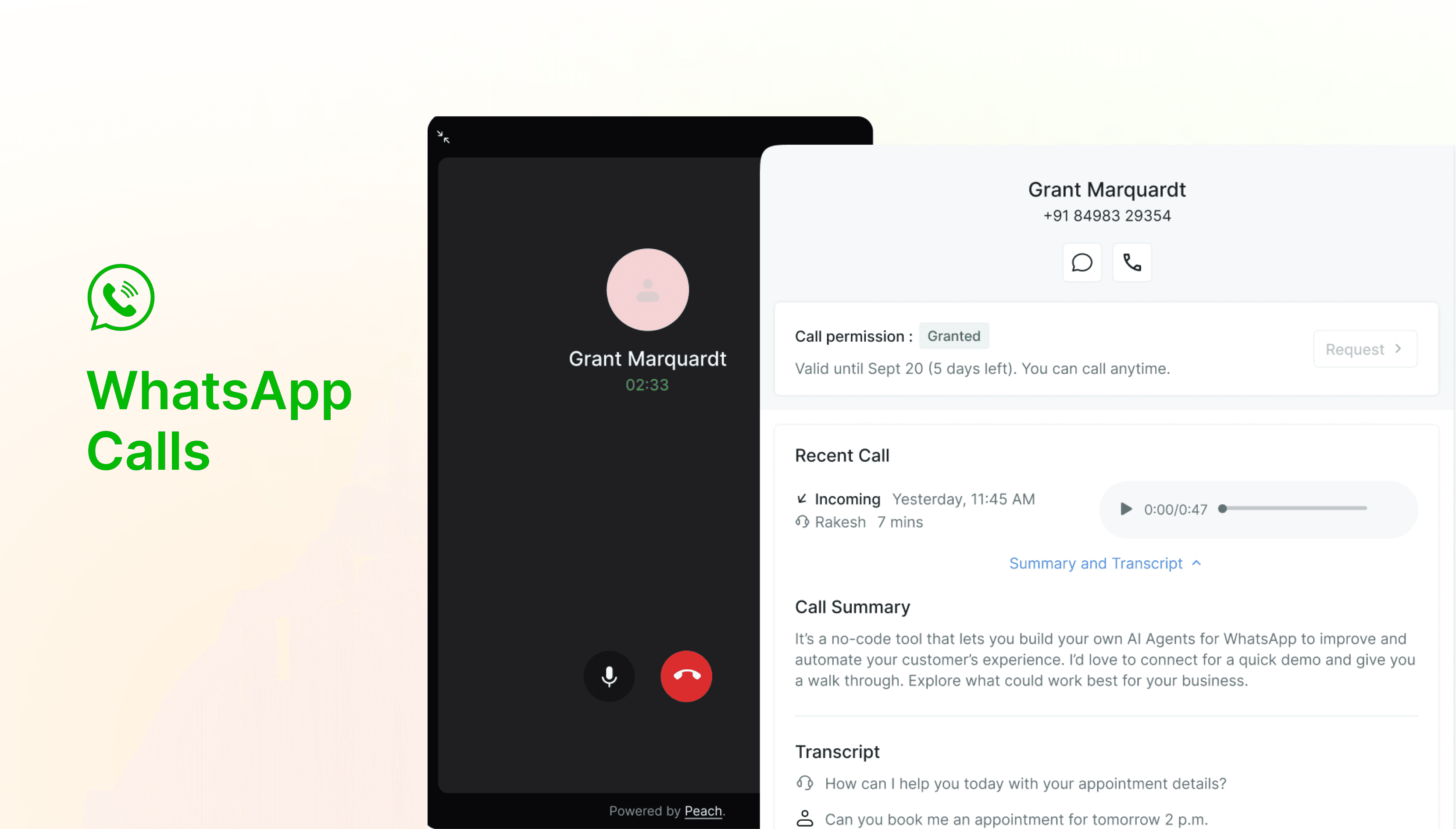 The agent makes or receives the WhatsApp call directly inside Peach. The entire conversation history is visible in the same interface. If the customer mentioned three months ago that they'd tried a competitor, that is right there. The agent does not have to ask again.