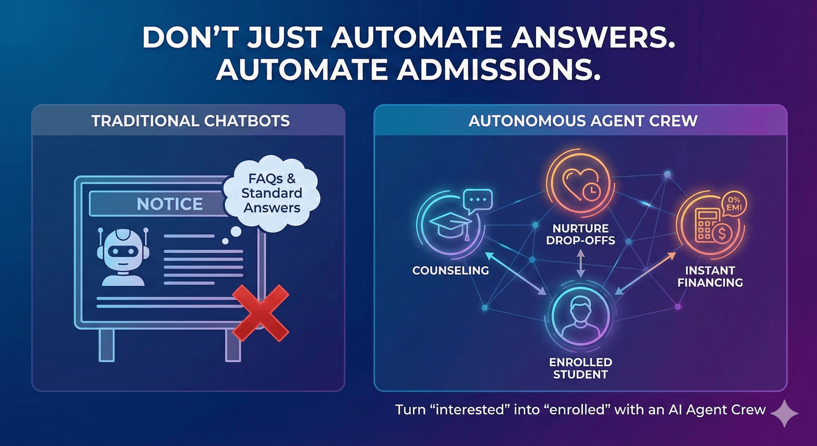 Unlike Wati or Gallabox, which force you to build one giant, failing bot, we deploy a Crew of Specialists designed for the student lifecycle.