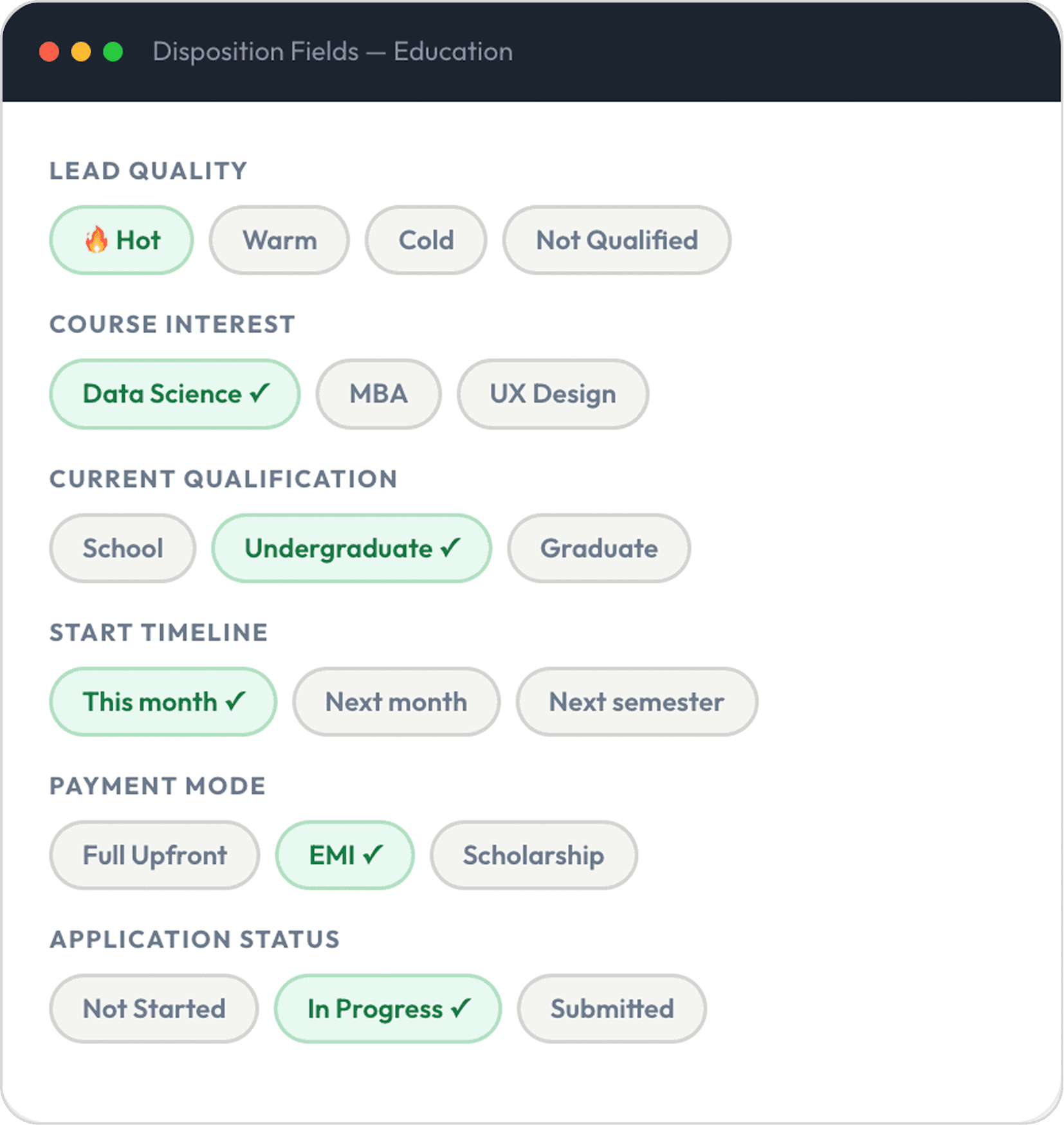 Peach's Disposition Fields turn every WhatsApp conversation into structured enrolment pipeline data. Admissions managers see a live funnel view — how many leads are at each stage, where they're dropping off, and which counsellors are converting the most enrolments.