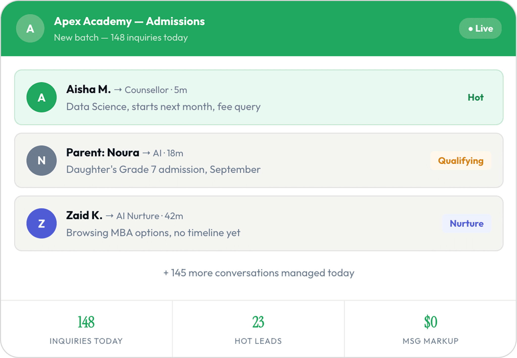 Deploy AI qualification agents that respond in Arabic. Students and parents messaging in Arabic get natural, fluent responses without switching to a human agent for translation.
