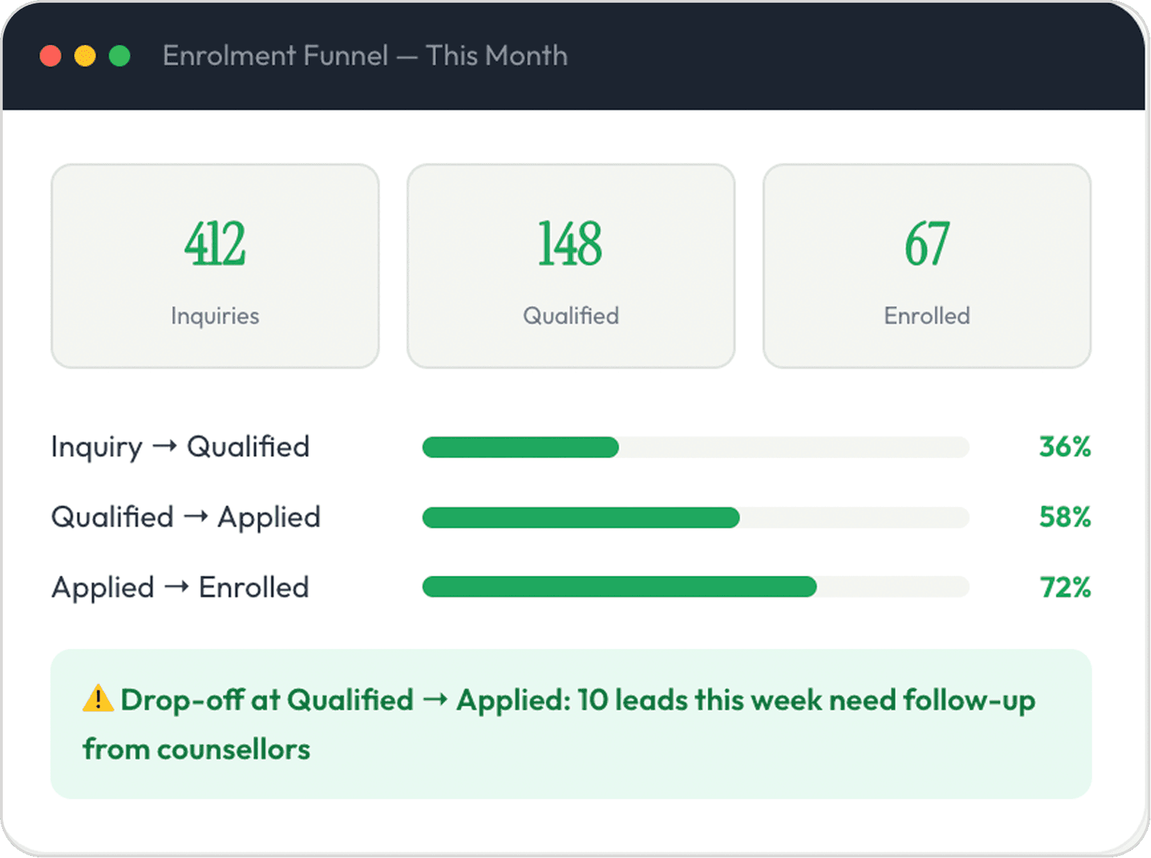 Track Every Lead from First Inquiry to Confirmed Enrolment.