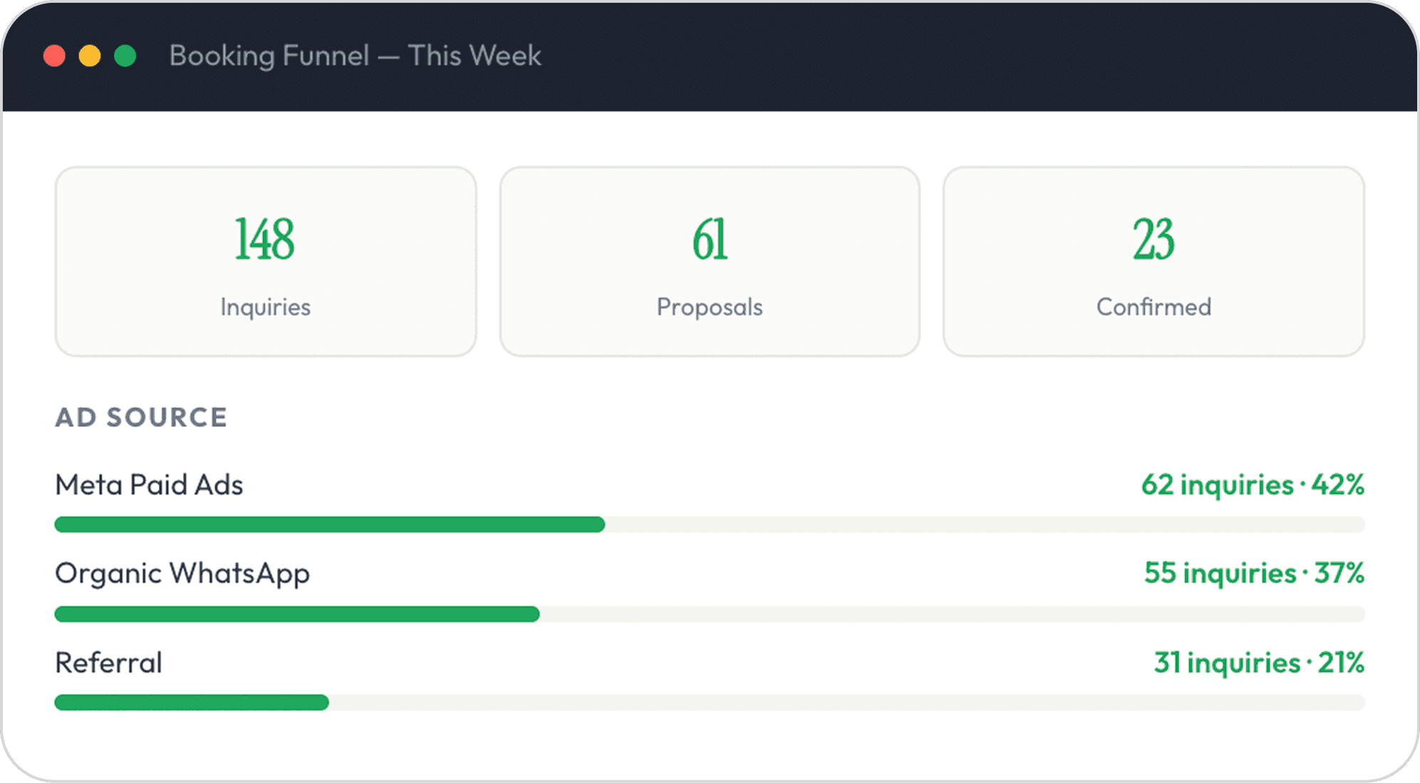 Funnel: Inquiry → Qualified → Proposal Sent → Confirmed → Dropped