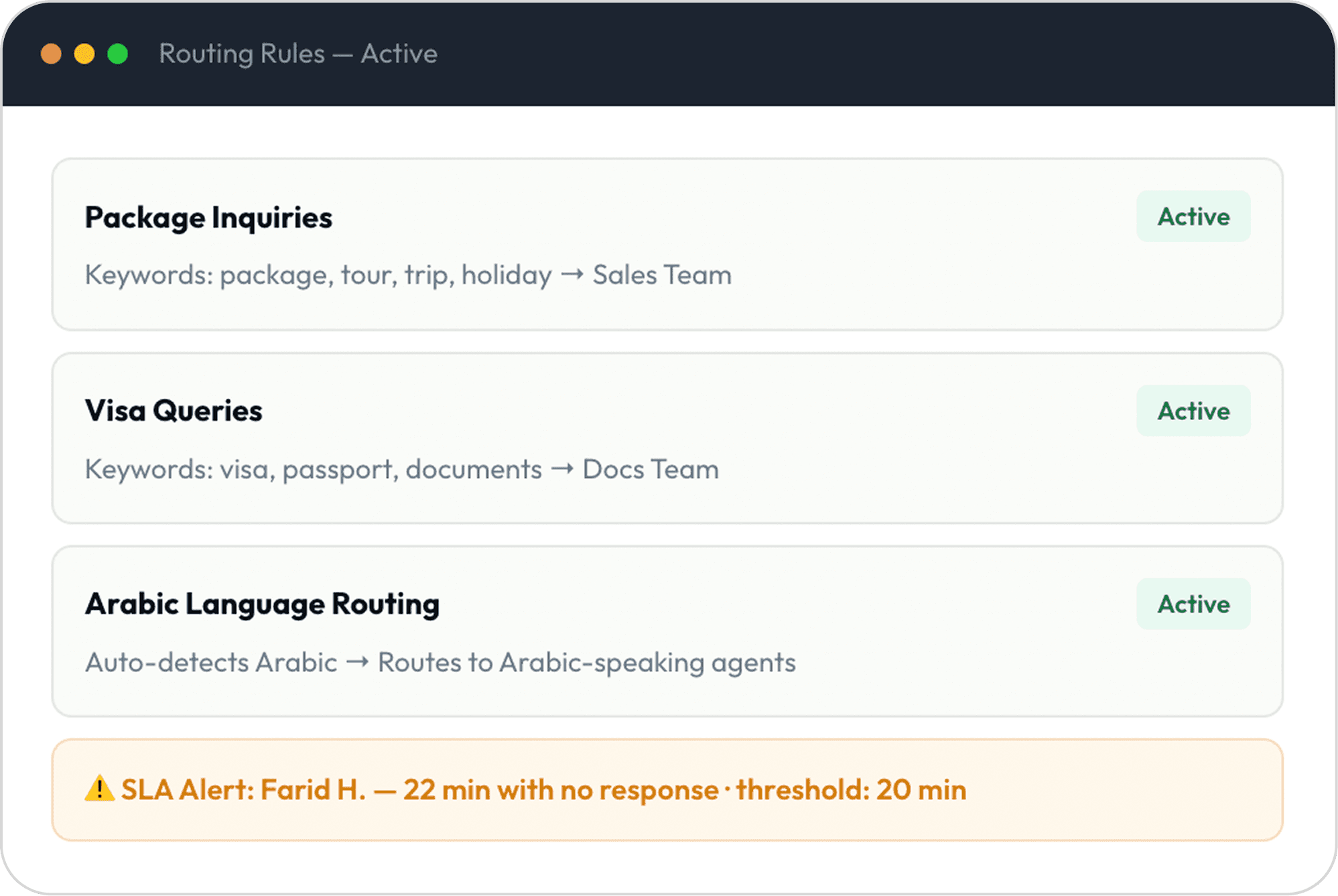 Set routing rules so package inquiries go to sales, visa queries go to documentation, and post-booking support goes to operations. Language-based routing sends Arabic-speaking customers to Arabic-speaking agents. SLA timers alert managers if any inquiry goes unanswered.