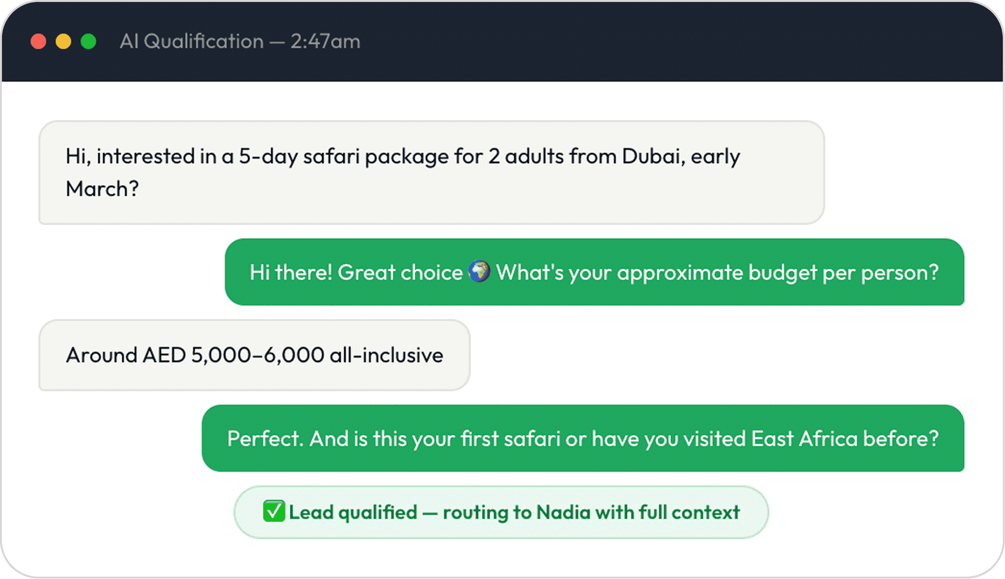 Peach AI qualifies leads by asking the right questions — destination, dates, budget, group size — and routes the conversation to the right human agent with full context ready. No lead ever waits until morning.