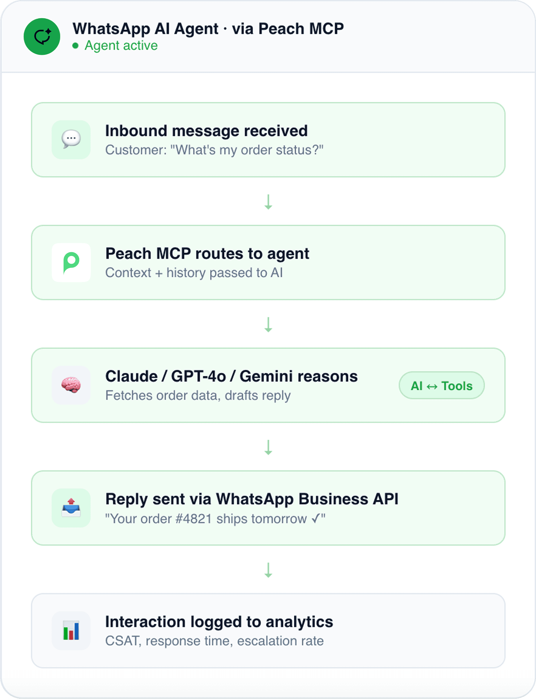 Add your Peach API key to Claude, GPT-4o, or Gemini. WhatsApp Business API pre-verified. Live in 5 minutes.