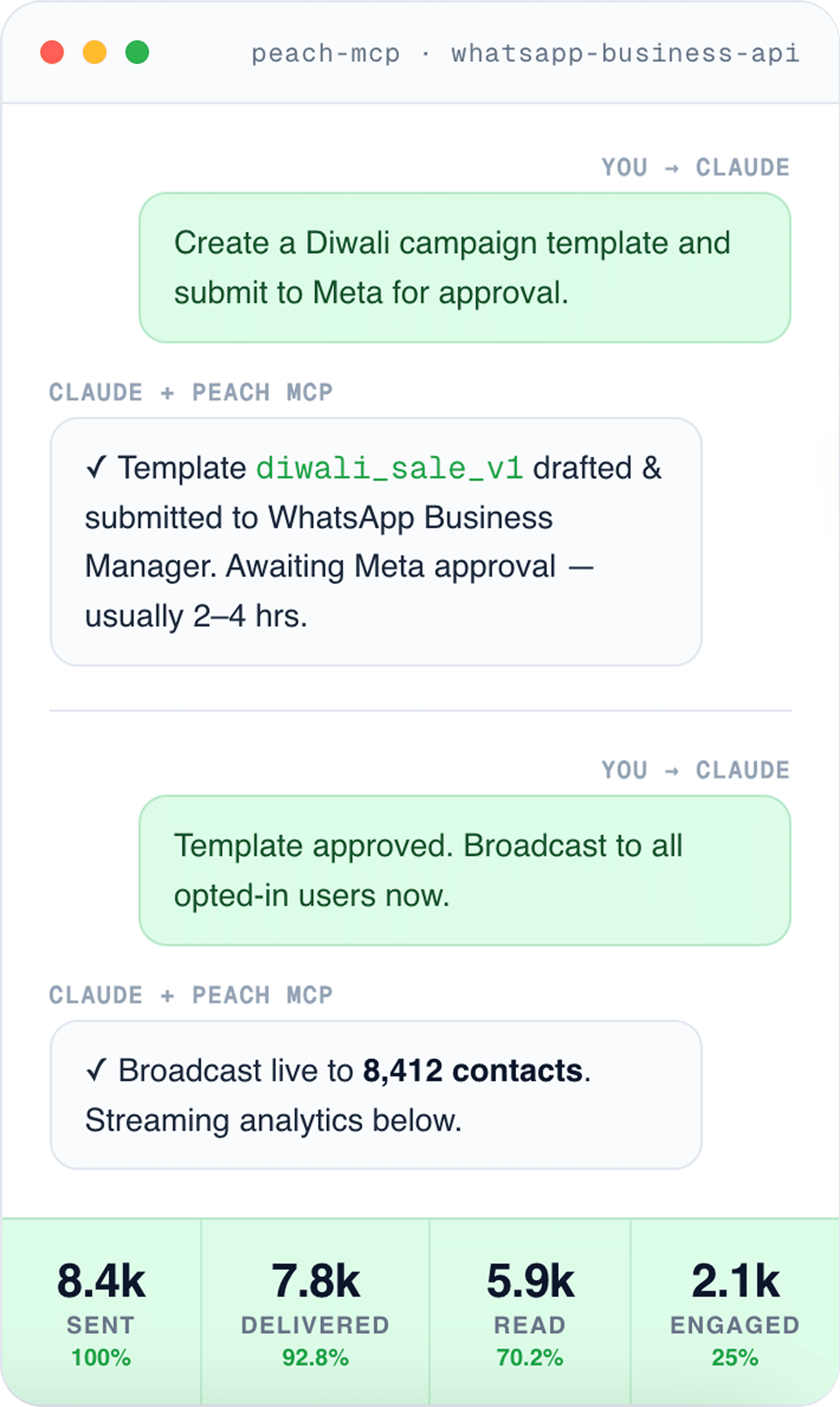 Type your campaign in natural language. Peach handles compliance, template formatting, and Meta submission.