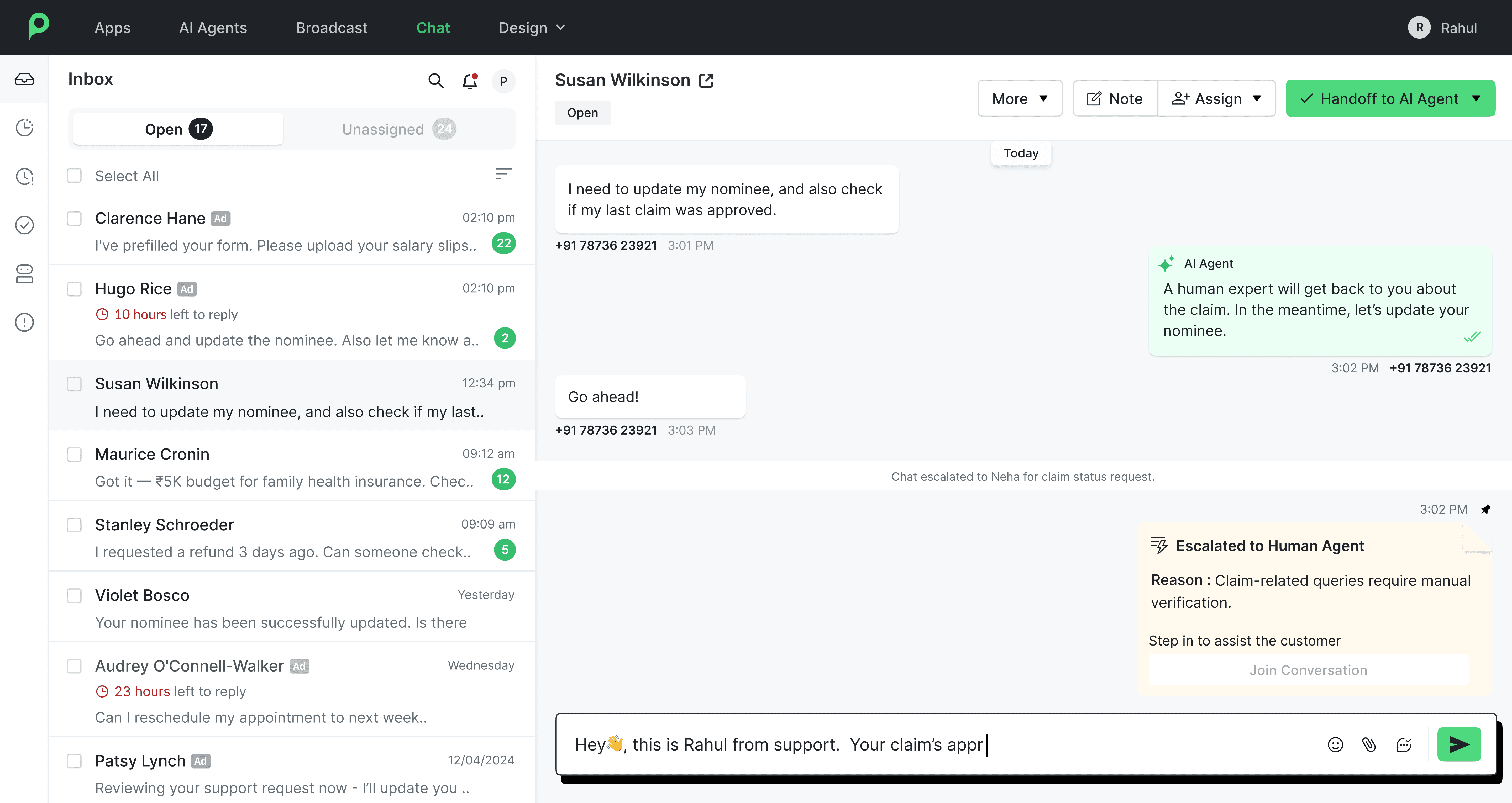 Peach AI acts as your 24/7 first line of defense—instantly qualifying sales prospects and resolving common support queries. It filters out the noise and seamlessly hands over complex conversations to the right agent with full context.